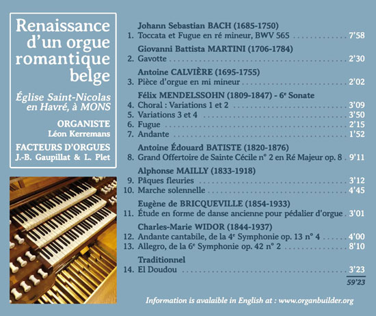 Au point de vue répertoire, en dehors des œuvres de J .S. BACH qu’il joue volontiers, Léon KERREMANS a une prédilection pour le dix-neuvième siècle.