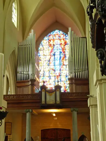 En 1893, Pierre Schyven réalise son seul orgue entièrement pneumatique de 3 claviers dans une église menacée de démolition. Il l’installe dans le buffet de l’ancien orgue qu’il doit modifier. Une fois l’église reconstruite, la firme Stevens reconstruit l’orgue dans un nouveau buffet très succinct séparé en deux afin de laisser visible la nouvelle verrière. Les transmissions pneumatiques sont supprimées et remplacées par un nouveau système électrique et une console neuve. Les sommiers à membranes sont cependant conservés ainsi que la tuyauterie de Schyven mais la composition est complétée par des ajouts néoclassiques. En 1971, le sommier de récit, très endommagé par le chauffage, est remplacé par un sommier électrique par Aerts & Castrel.